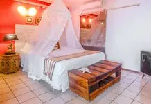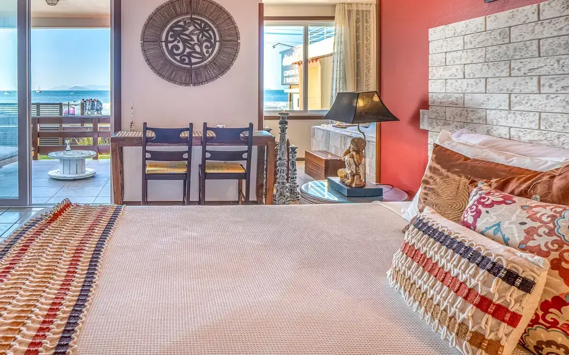 Essa suíte de frente para a enseada tem uma energia mágica que transmite tranquilidade e paz. Cores quentes, mandala e enfeites orientais nos remetem à cultura asiática deixando o ambiente muito elegante e harmonioso. Da sacada o visual é lindo e pode se observar o nascer do sol.