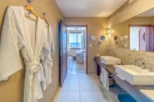 • Banheiro privativo amplo com duas duchas, duas cubas, secador de cabelo, espelho de aumento, roupão e aquecimento central de água